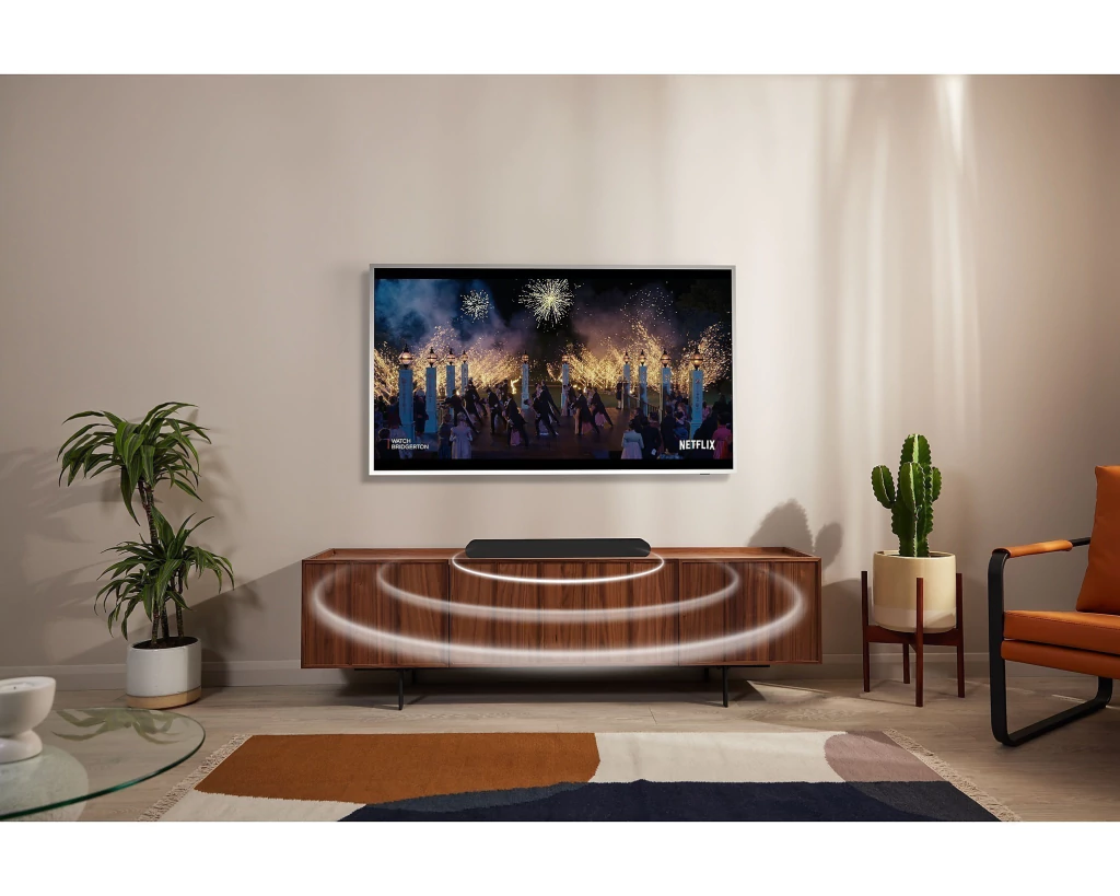 El sistema todo en uno proporciona un potente sonido envolvente de 5.0 canales junto con 4 woofers y 3 tweeters integrados en un marco compacto que podés colocar en cualquier lugar de la habitación